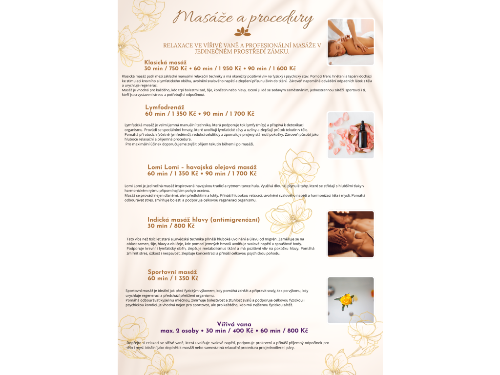 Zámecké privátní wellness nabízí masérské služby a fyzioterapii